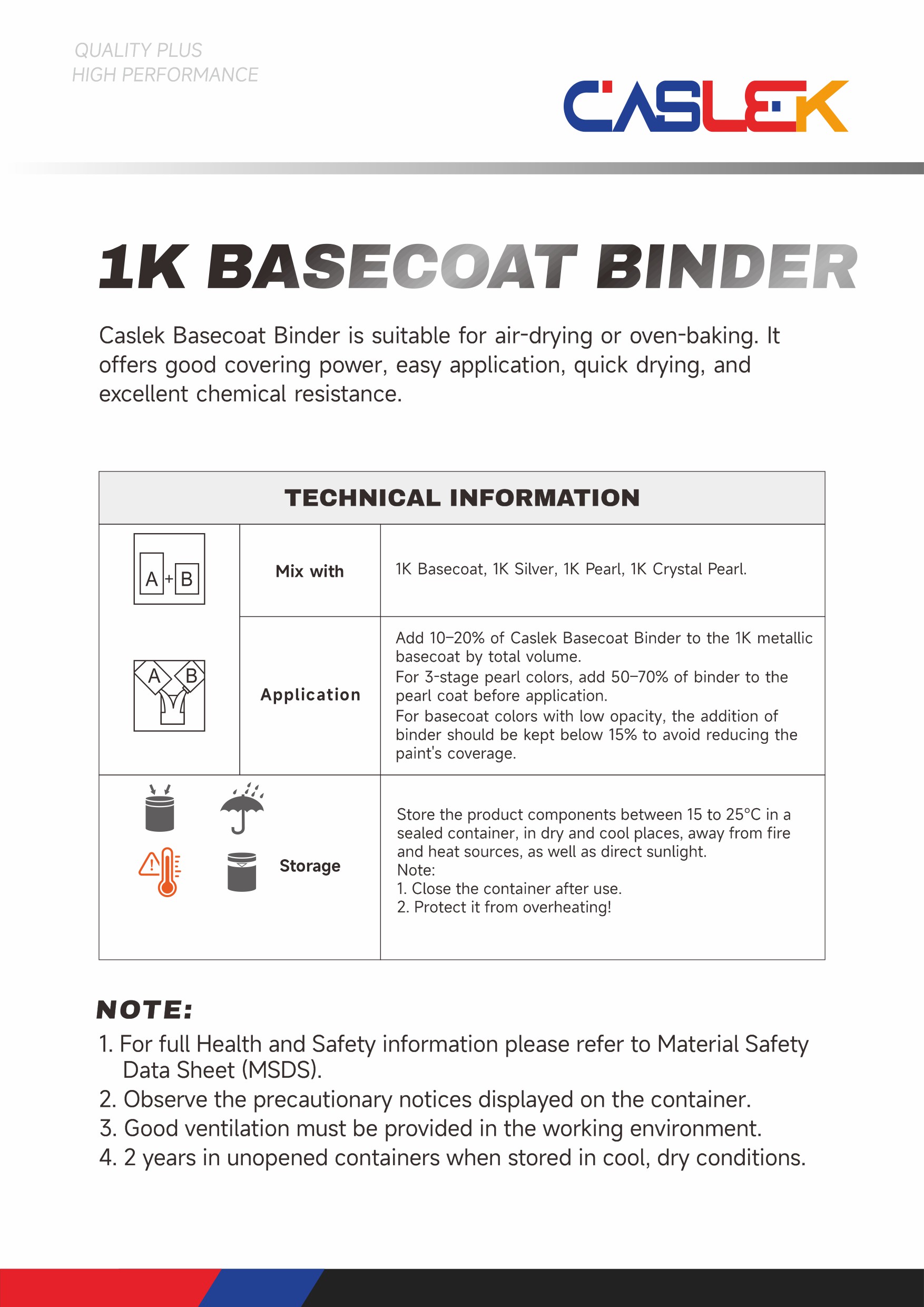 Caslek Basecoat Binder is suitable for air-drying or oven-baking. It offers good covering power, easy application, quick drying, and excellent chemical resistance.