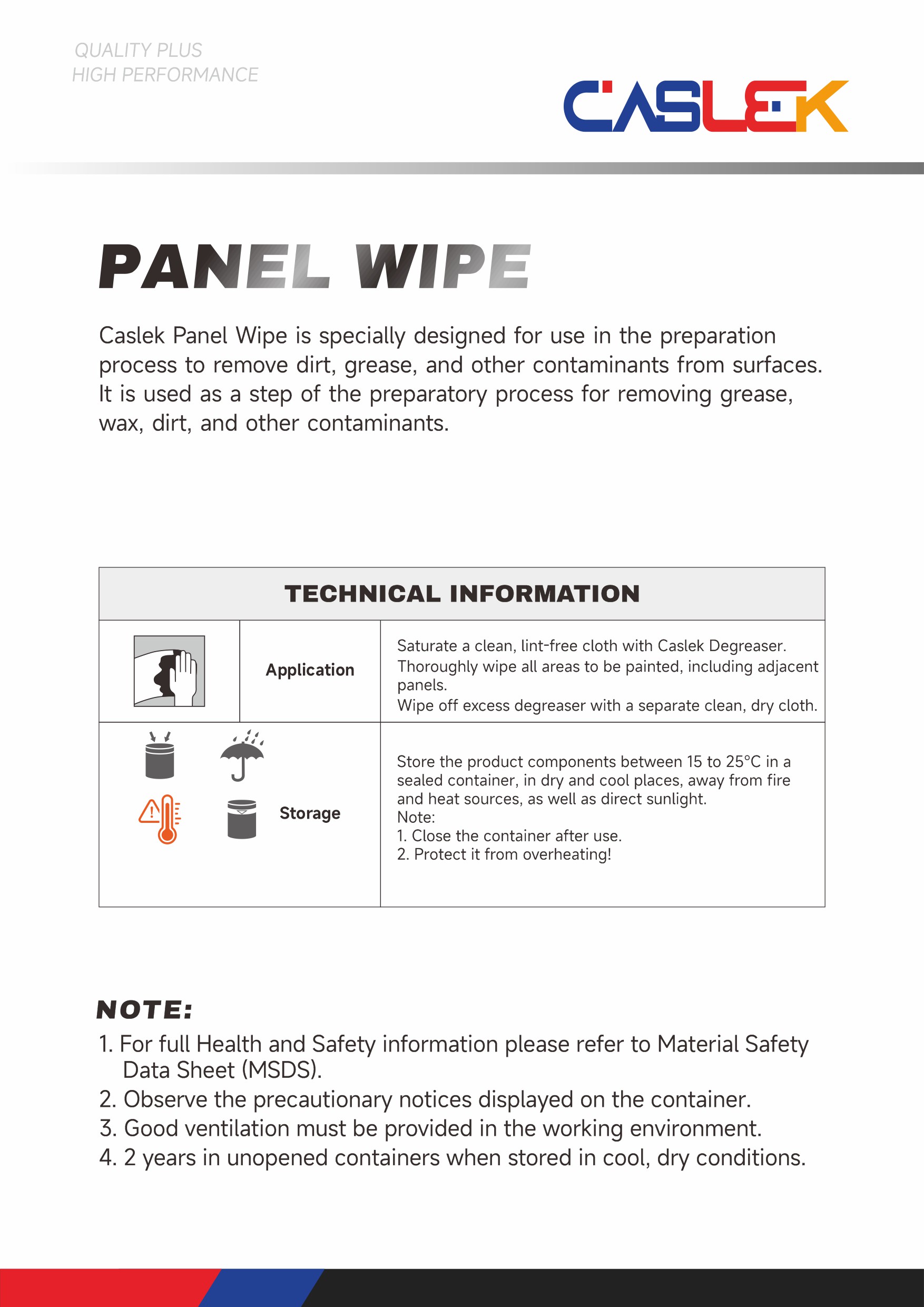 Caslek Panel Wipe is specially designed for use in the preparation process to remove dirt, grease, and other contaminants from surfaces. It is used as a step of the preparatory process for removing grease, wax, dirt, and other contaminants.